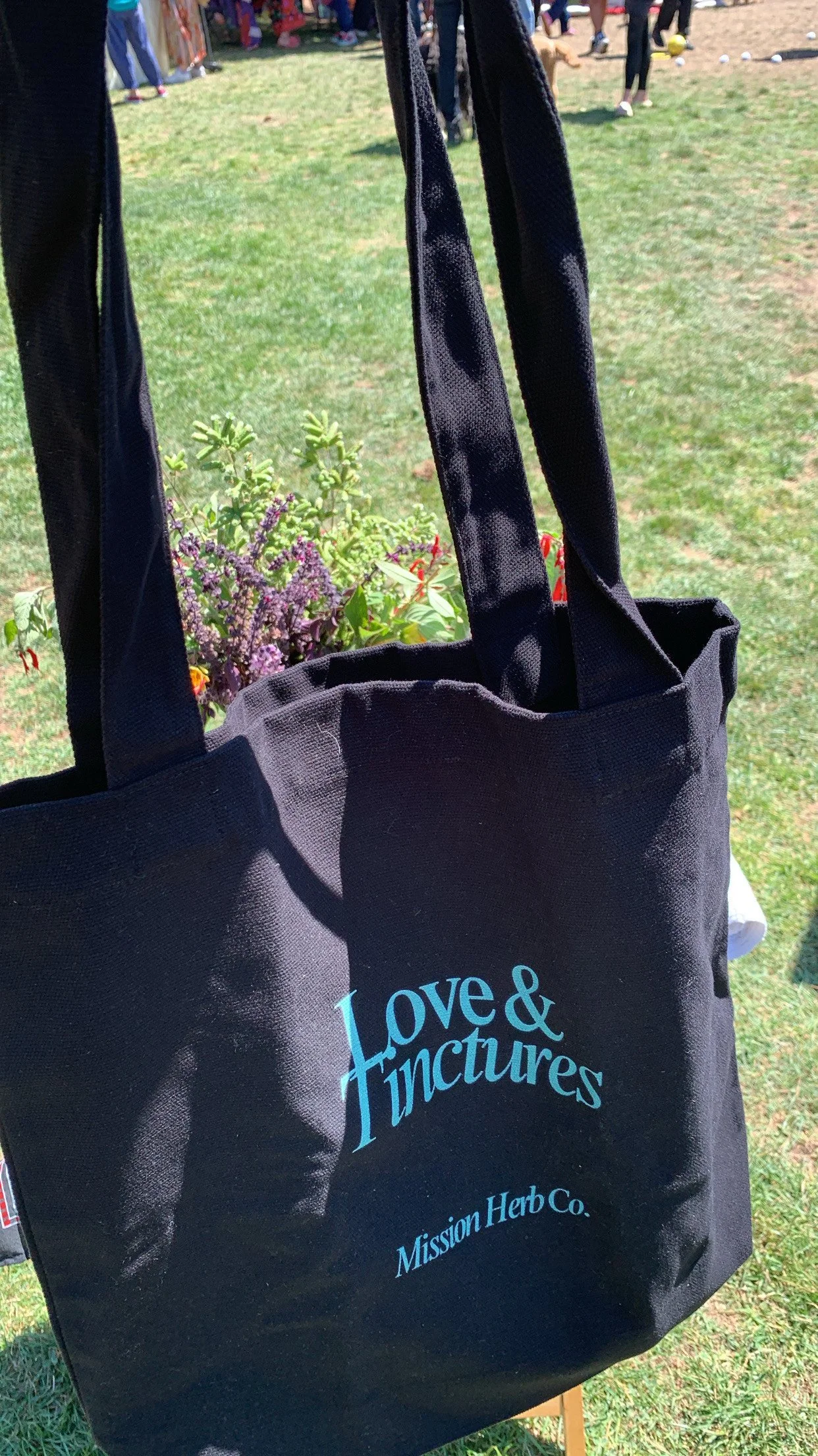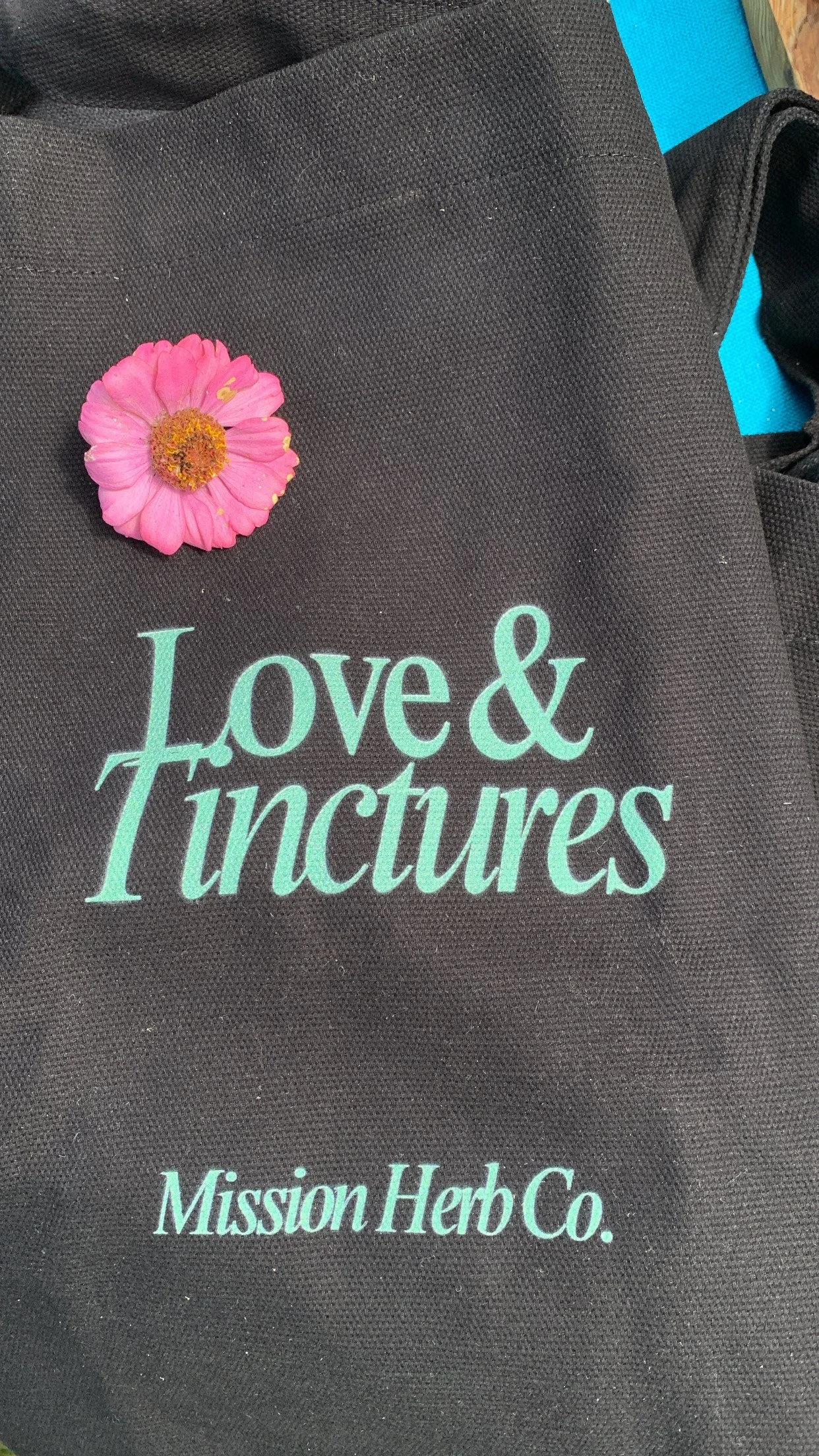 Mission Herb Co.’s Love & Tinctures black tote bag. Carry all your sacred things in style repping our mission of love and healing, for all.